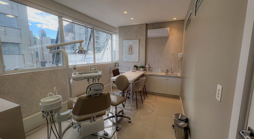 Muita luz natural, compacto, climatizado, equipado com escritório personalizado, cadeira odontológica completa, mocho e carrinho odontológico, bancada com pia, clean, sofisticado. Recomendado à cirurgiões dentistas.